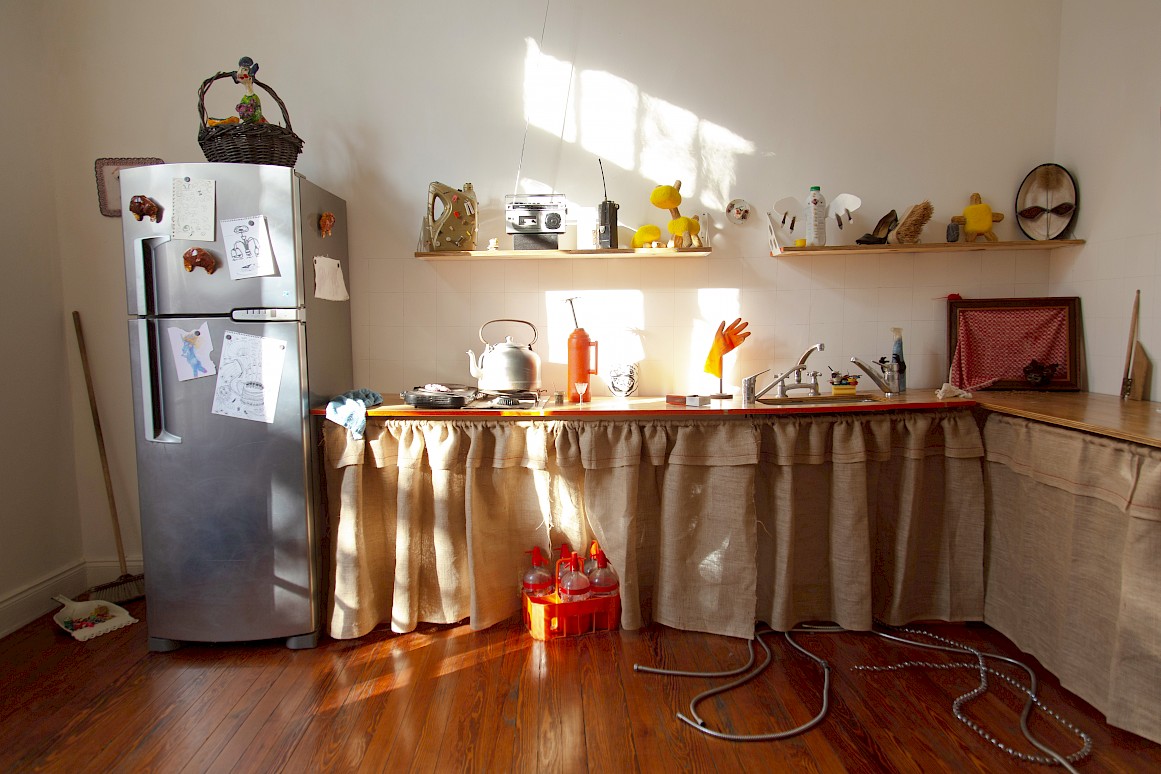 Cuando paseo por la calle Belgrano miro las cocinas de los estudios de decoración, esos ambientes desarmados y que se transforman en vidrieras, pero que también se vuelven chatos, como si por faltarles una pared, les faltara también una dimensión. El sueño de las instalaciones es realizar el arte libre. Convertir el espacio en un tabernáculo, en un gran acto litúrgico. Una cocina también es un delirio de la gravedad, un punto en el que el agua escurre: y alrededor de ese punto se organizan los objetos y las vidas. A mi abuela le gustaba quedarse todo el día en la cocina, tal vez porque no había mucho que hacer afuera, en compañía de un gato. Con la cocina a leña, el lugar parecía una especie de fragua.