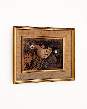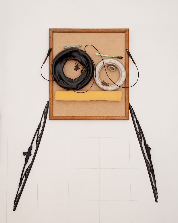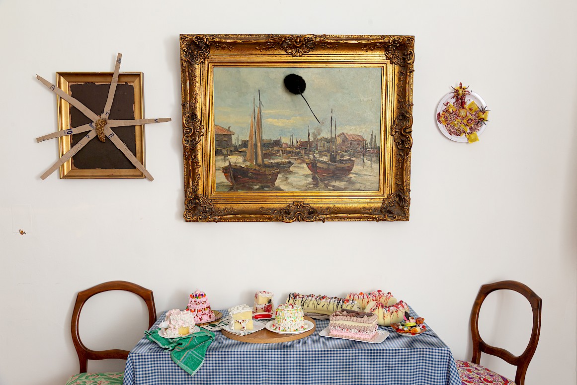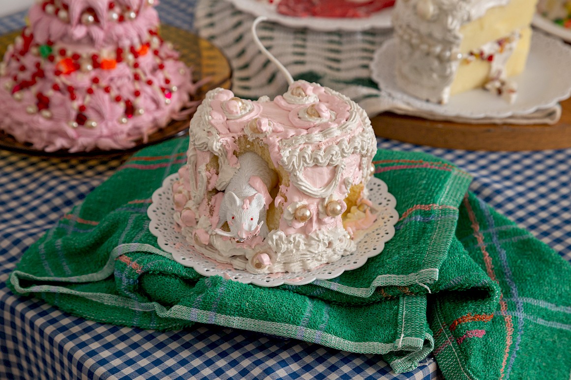 Dos acciones contrarias producen un efecto en común. Los objetos de Herbi comienzan con material de rezago: goma espuma, cosas de cotillón, masilla… Con todo eso, él va pensando ideas plásticas simples pero muy cargadas de emoción, como las ideas de un cuento. El relato de cada cosa (de cada cosa que se transforma en cosa: torta, araña, o producto de limpieza asesino) funciona como relato porque entre la idea y su realización intermedió un extraño poder de síntesis. Ese poder invisible y a la vez revelado en sus frutos es lo que los trabajos tienen de siniestro, en una clave sutil. Hay una realidad oculta que se revela en los ravioles ensangrentados y en los escombros de comida, de una forma que no se podría revelar si las cosas solo fueran su propio signo (como el signo medialuna, o el signo torta), que necesita una realización escultórica, una encarnación material.